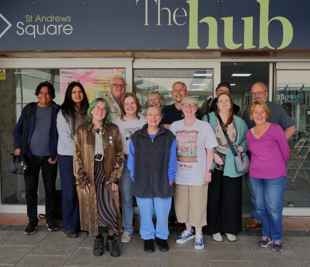 The Hub was located in St Andrews Square, Droitwich, between Holland & Barrett and Quality Crust Bakehouse. It was a community space. If people were shopping or just walking through Droitwich, they could come in, sit down, and relax. They could browse the books and magazines, and look at the artwork. We did not serve food or drinks, but visitors were welcome to bring in a take-away drink from one of the cafes or shops. The Hub was open on Mondays and Fridays from 10am to 4pm, and on Saturdays from 10am to 3.30pm.